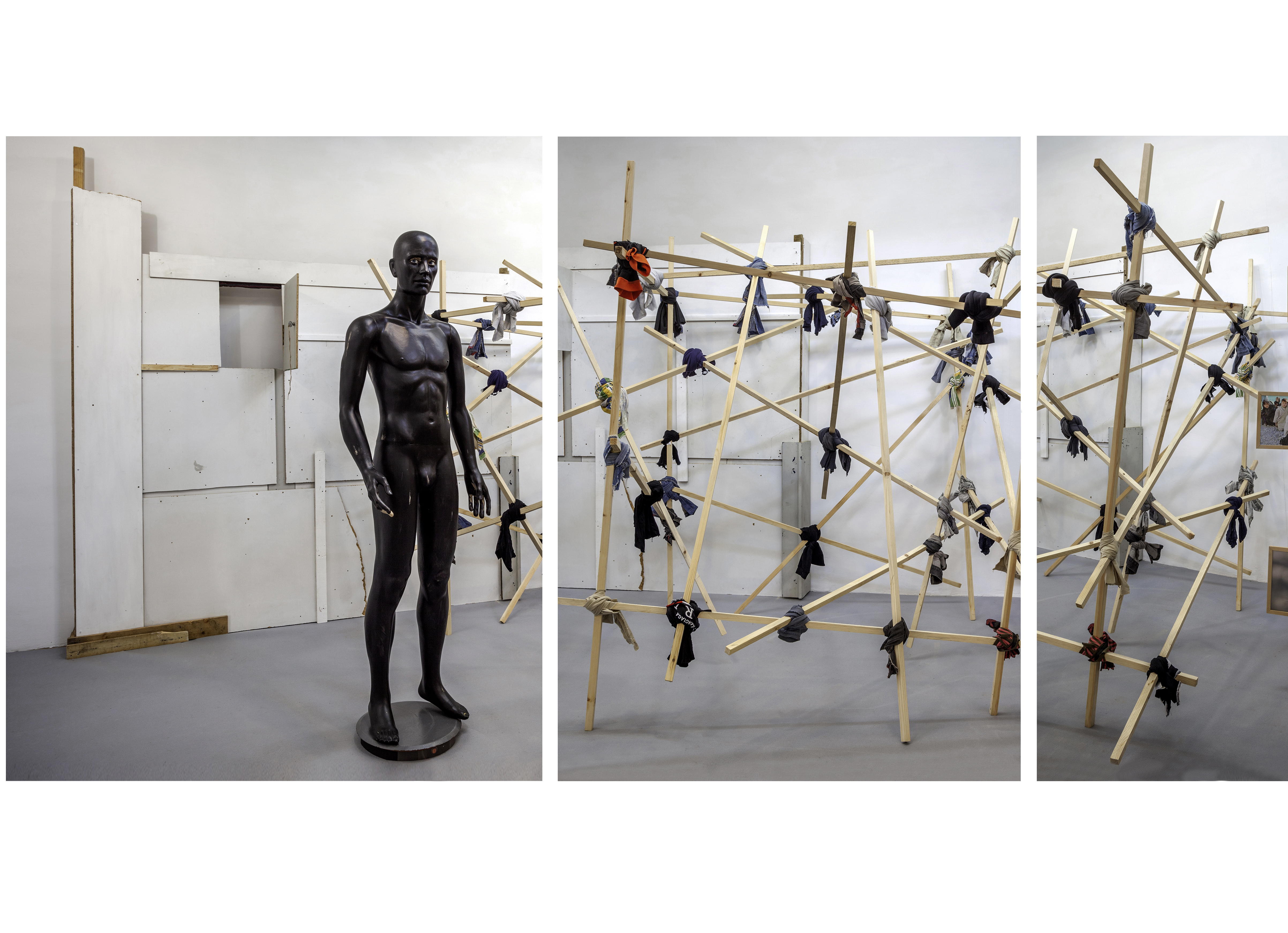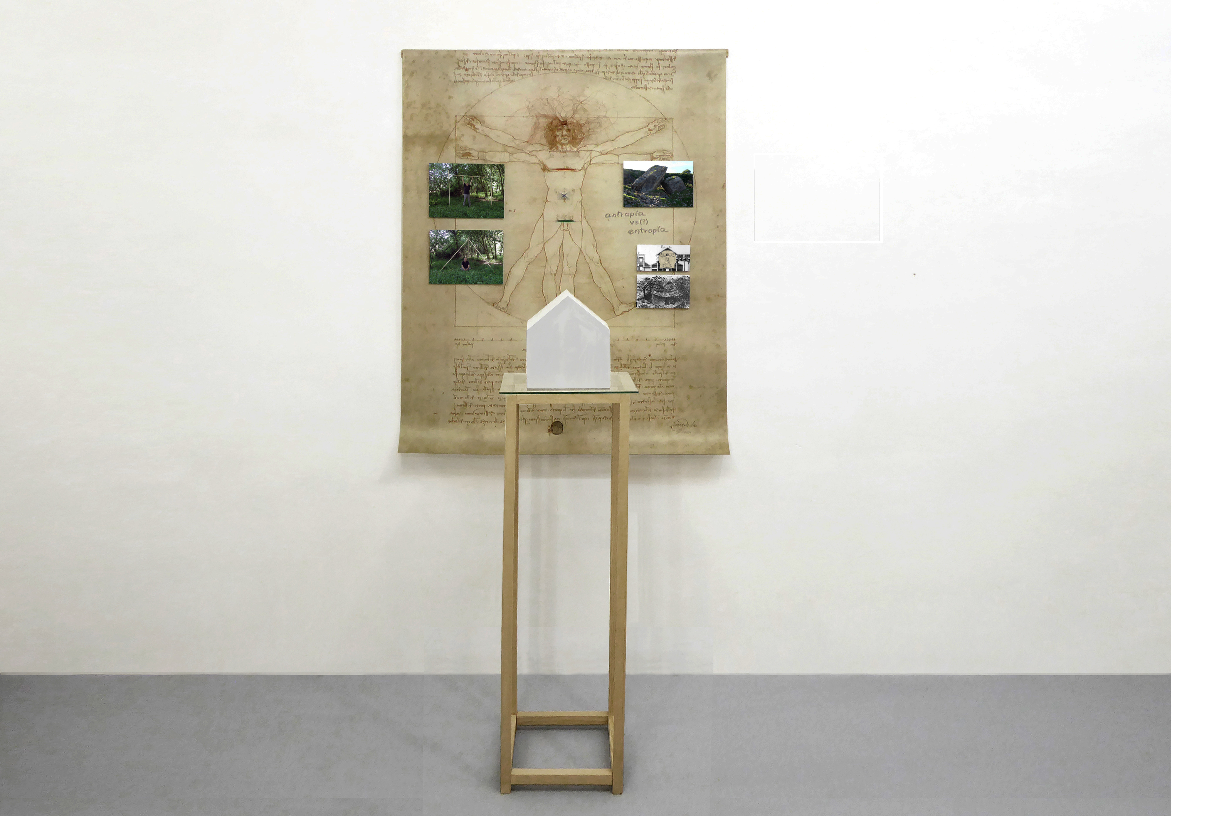 Desde ese mismo descentramiento, la exposición aborda la configuración de los ecosistemas sociales contemporáneos: redes móviles, estructuras heterogéneas, cuerpos errantes. La figura del migrante aparece entonces como contrapunto contemporáneo del Hombre de Vitruvio que, en vez de habitar una “primera casa” armónica, se enfrenta a una arquitectura de emergencia, erigida sobre estructuras precarias…