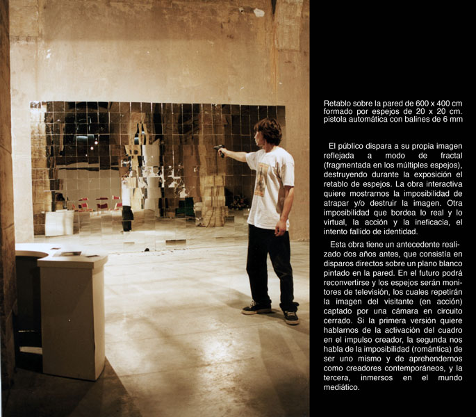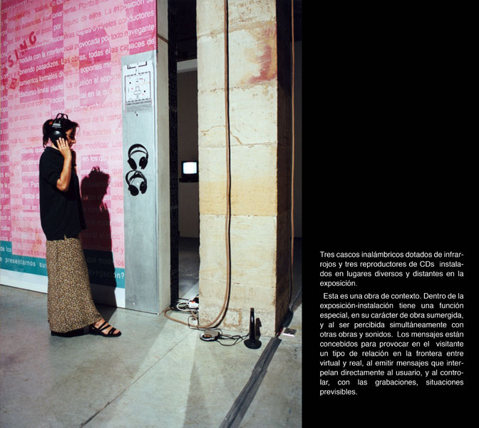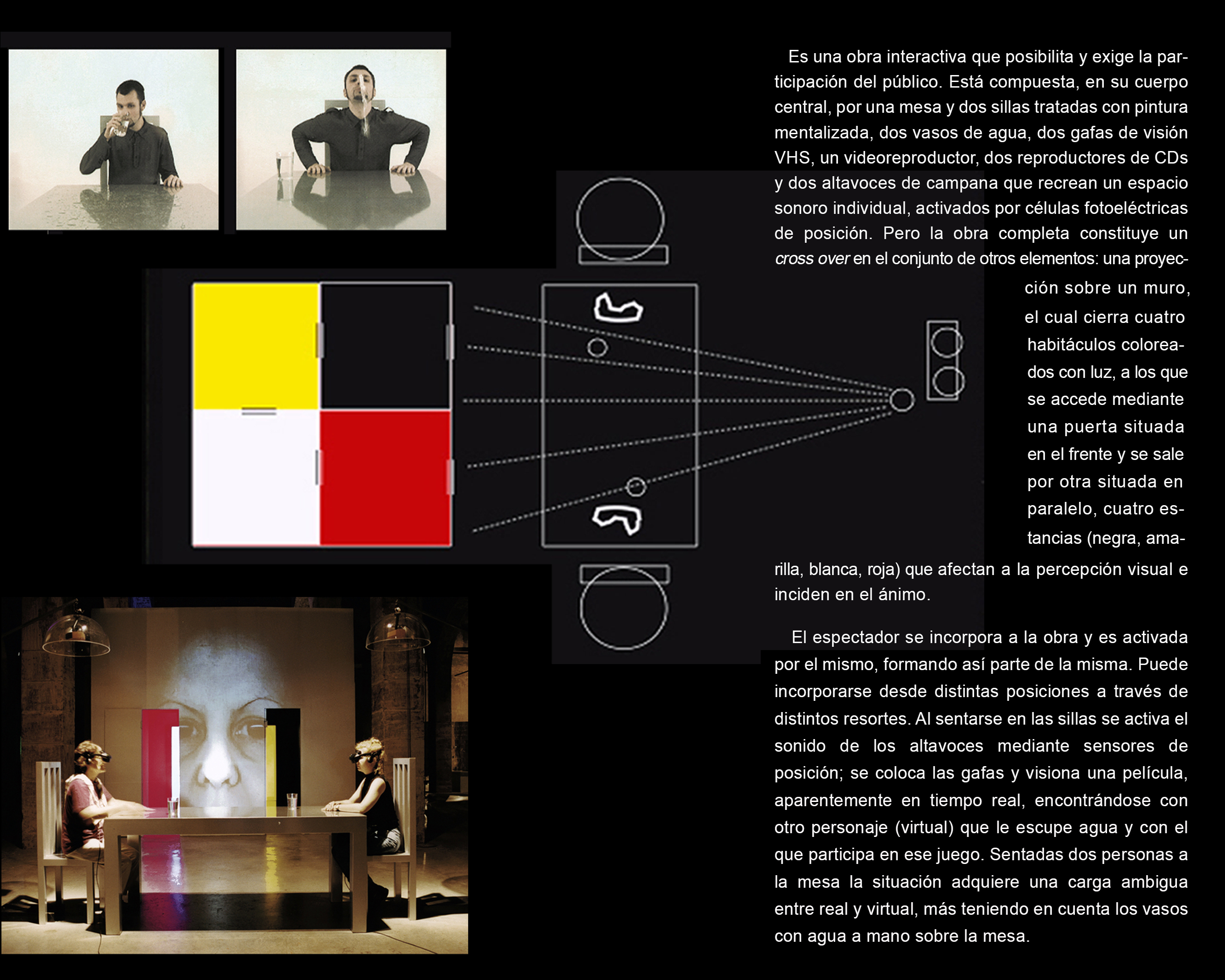 La instalación está construida a partir de la relación intencionada de realidades diferentes, secuencias cruzadas extraídas de situaciones y tiempos diversos, y con la utilización de técnicas artísticas tradicionales y nuevas tecnologías en espacios de encuentro, provocando mezclas e incorporando al espectador (+ "instrumentalizar al espectador") en el proceso 'manipulable' de la instalación (= "construmentalizar"). Leer más